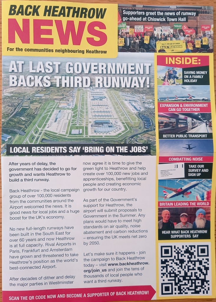 31st July Heathrow’s ‘grass roots’ community group has been distributing flyers in support of the proposed new runway, as in previous years their claims are preposterous e.g. that 100.000 people locally support the news of expansion hopefully going ahead; this number has no explanation or evidence behind it. In addition, they also claim (as previously) job numbers that are implausibly high by stating that the new runway will result in more jobs than are linked to Heathrow now!! The reality is that short term temporary construction workers would be brought in from outside the area only as required and once up and running the longer term jobs would be minimum wage e.g. retail in terminal and even many operations jobs now have been dumbed down and don’t pay much. Treat this organisation with a large pinch of salt and cynicism.